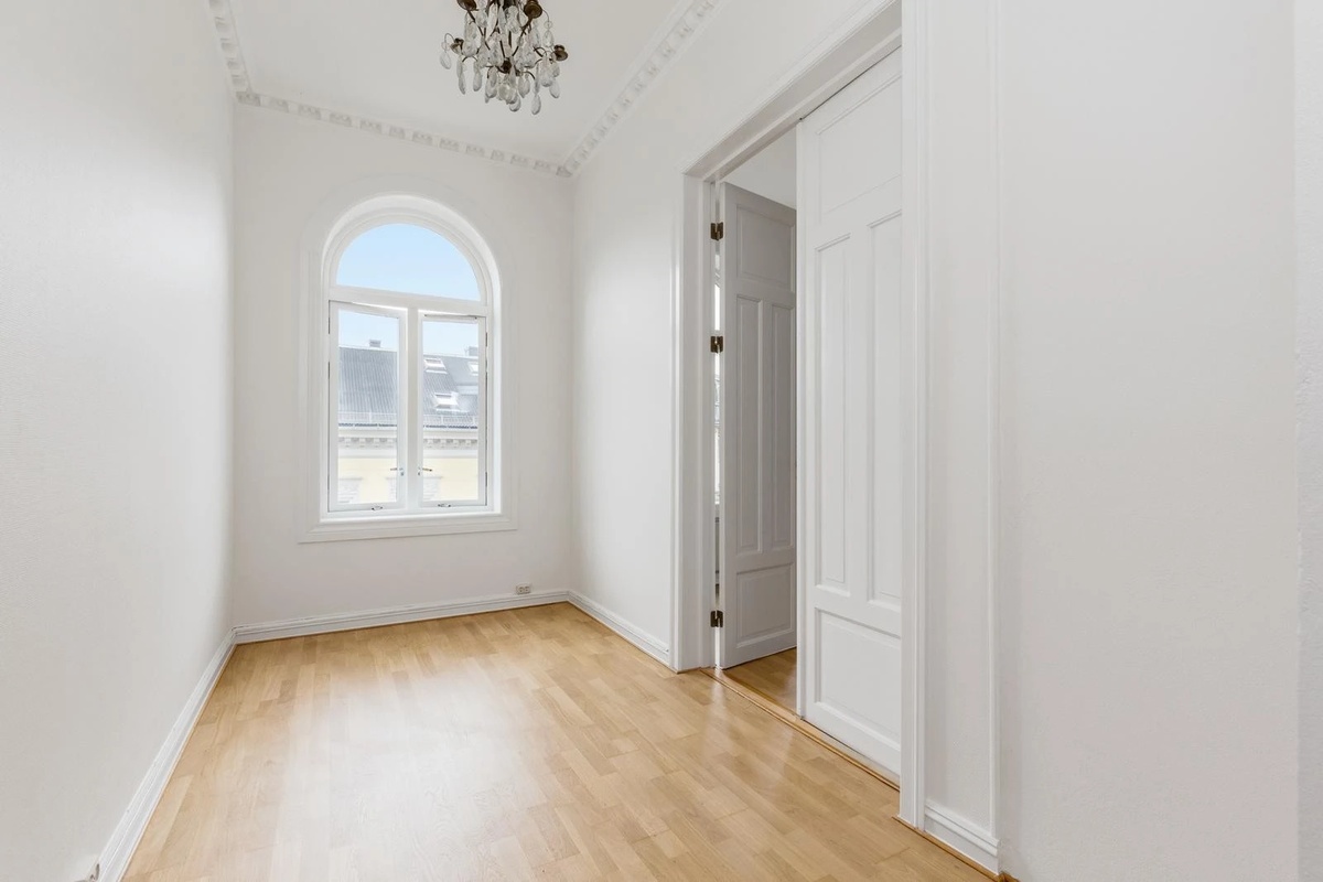 Leiligheten ligger i 4.etasje og er 95 kvm. Leiligheten har stor stue, peis, balkong, heis, bod, mye skapplass og tre soverom. Vi har alt av møbler og kjøkkenutstyr. Det er det minste rommet som leies ut, helt umøblert, men det er god nok plass til både dobbeltseng, pult og klesskap. Leiligheten ligger svært sentralt i Vika, med få minutters gange til Aker Brygge, Solli plass, t-bane, tog, trikk og buss. Husleien er på 9500,-. Strøm og nettleie kommer i tillegg. Depositum er på 30 000,-.