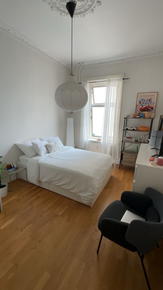 Soverommet er på 16kvm, med vindu ut mot koselig bakgård. Rommet har høy takhøyde med stikatur i taket. Rommet har et stort dobbeltklesskap med speil skyvedører som er fastmontert. Taklampe følger med. Mulighet å kjøpe sengeramme fra tidligere leieboer til 2000kr, brukt under et år (140x200cm). Sengeramme med fire oppbevaringsskuffer. Går an å få med kommoder hvis man ønsker.