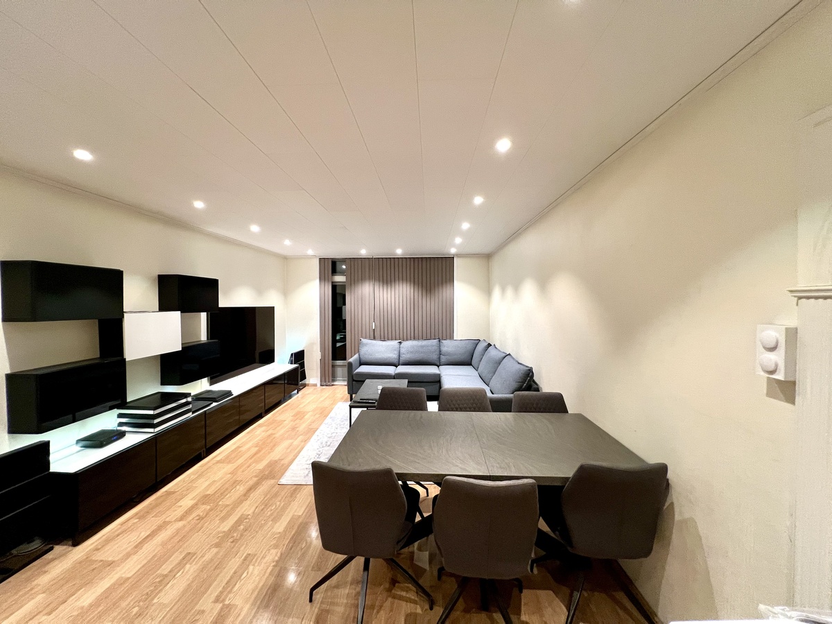 Stue med ny sofa, moderne TV (inkl. kabel-TV), nytt spisebord, samt skap og kommoder.