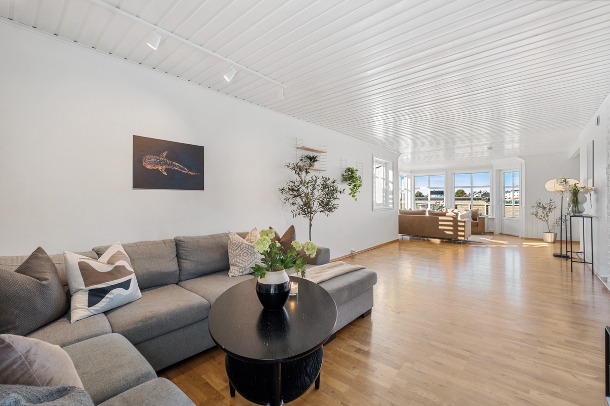 Det er et stort kjøkken med spisestue og stor stue, hvor det per i dag er møblert som to sittegrupper.