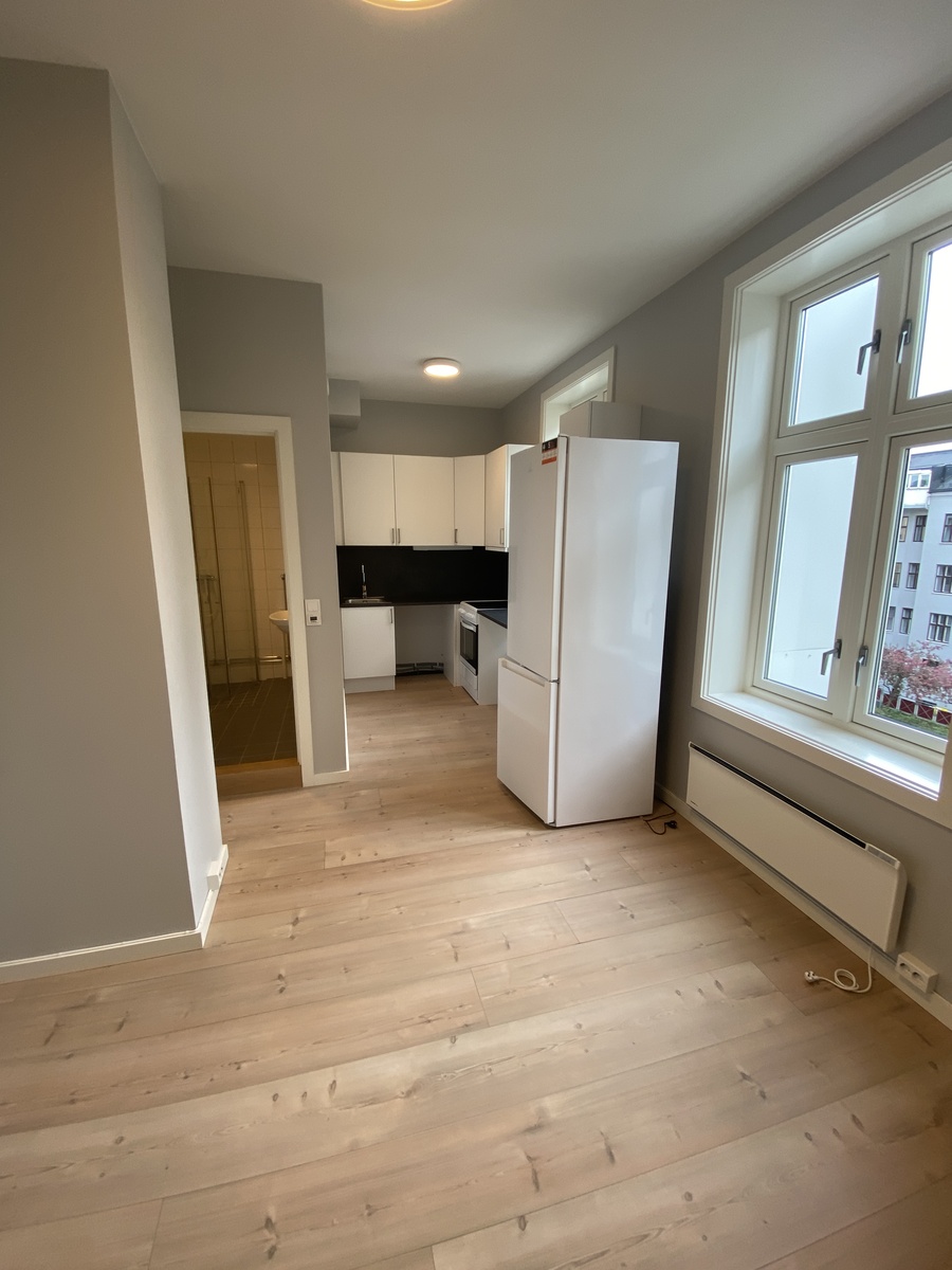Leiligheten har et stort og lyst rom med og stor kjøkken krok. Kombiskap og komfyr. God oppbevaringsplass og arbeidsplass på kjøkkenet. Forrige leietaker en liten oppvaskmaskin som ny leietaker kan kjøpe.