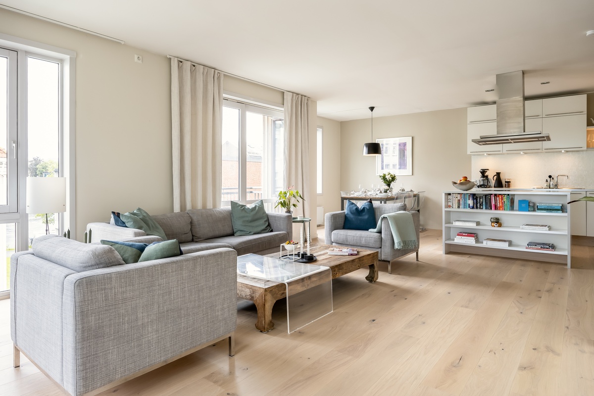 Her er det en lys og stor stue med åpen kjøkkenløsning. Stuen er møblert med sofagruppe, spisestue-møblement og eventuelt en arbeids-stasjon. Fra stuen er det utgang til 2 balkonger.