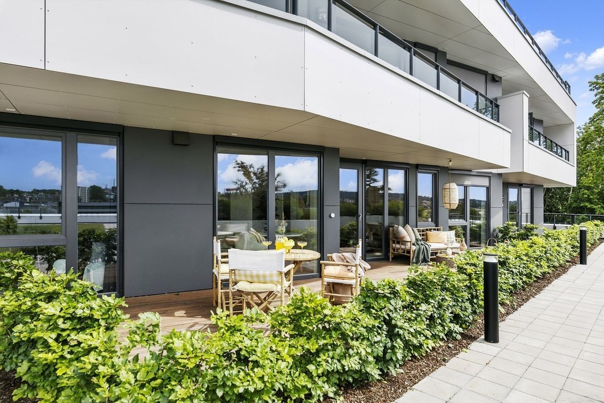 Leiligheten er fra 2020 og ligger på Kilen i høy 1. etg. med utsikt mot Slottsfjell og sentrum. Stor terrasse (39 m2 ). - Kjøl/frys, oppvaskmaskin og induksjonsovn på kjøkkenet. Noe oppvarming er inklusive.