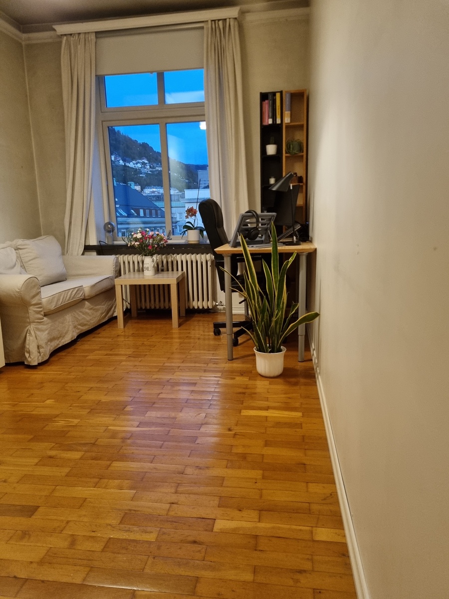 Jeg leverer master i desember, og ser etter noen til å overta rommet mitt i et hyggelig kollektiv på Torgallmenningen. Leiligheten ligger i sjette etasje i samme bygg som Volt og Carlings på Torgallmenningen, så man kan ikke bo mer sentralt i Bergen. Foruten rommet du flytter inn på, består leiligheten av tre andre soverom, entré, kjøkken, bad og separat toalettrom. I tillegg disponerer leiligheten en vaskemaskin og tørketrommel i felles vaskerom for de tre leilighetene i etasjen. Det er verdt å merke at leiligheten ikke har felles stue, men rommet er stort nok til at det kan innredes med sofa og stoler.