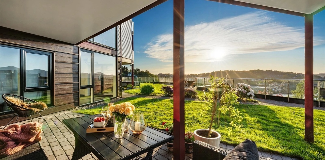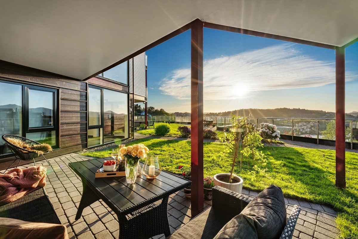 Unik 3-roms i fremste rekke med flott utsikt og solrik terrasse | Barnevennlig område | Fast parkeringsplass i garasje