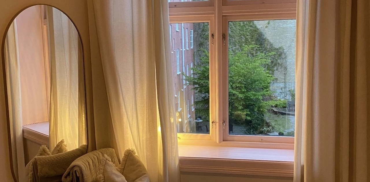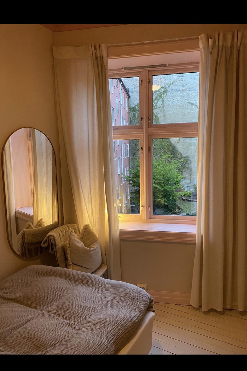 Rommet vender mot bakgården og ligger i den rolige enden av leiligheten, så du får både lite støy og godt privatliv. Rommet er lyst og delikat, med store vinduer, varme farger og en lun atmosfære.