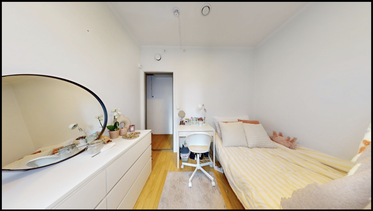 The room is 6.5 sqm – compact, but practical and easy to make your own. It’s furnished with a bed, wardrobe, shelf unit, and bedside table, as well as a small TV-bench next to the bed with space for a TV.