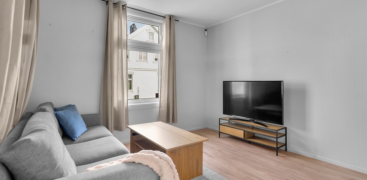 Inneholder stue med store vinduer og gang med kjøkken og vaskemaskin. Disponibel hage med spiseplass og grill like utenfor. Som på bilder er det et tomanns-soverom og et gjesterom. Det er også disponibelt treningsrom i bygget med diverse treningsutstyr(se bilder).