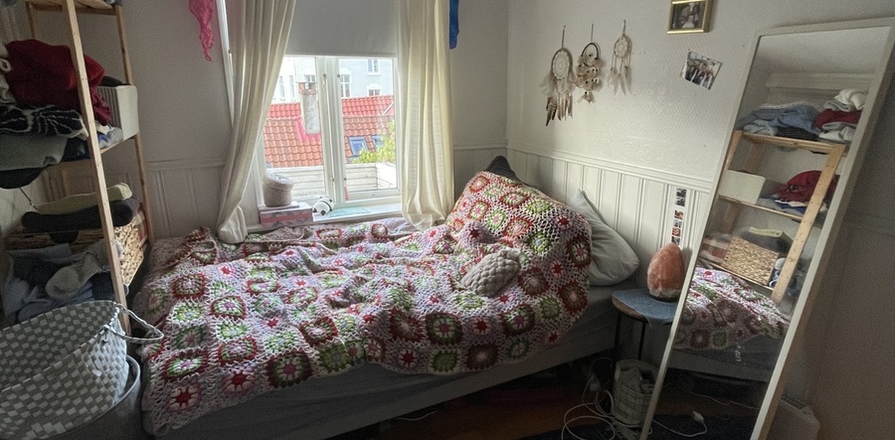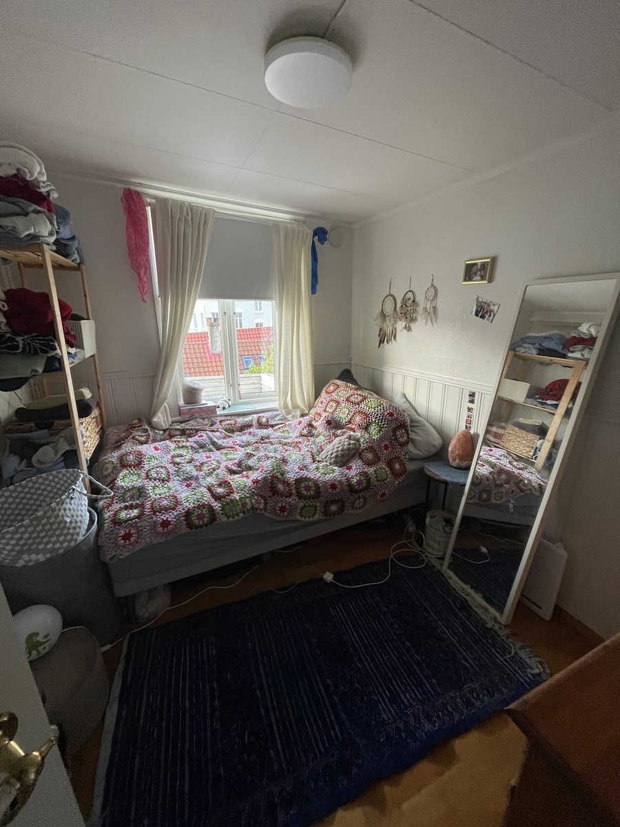 Rommet er lyst og trivelig, med plass til seng, skrivebord og garderobe. Det kan leies møblert eller umøblert etter ønske. Du deler kjøkken, stue og bad med tre hyggelige jenter i 20-årene som studerer og jobber på siden.