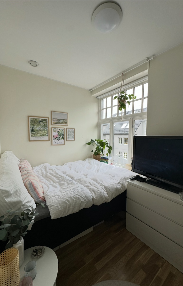 Rommet vil leies ut fullt møblert; med 150x200 seng, pult, kommode, tv og klesskap. Det er høyt under taket, i tillegg til stort vindu som gir mye lys. Rommet er ledig fra 1. januar 2026.