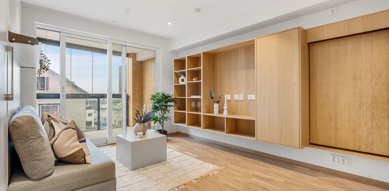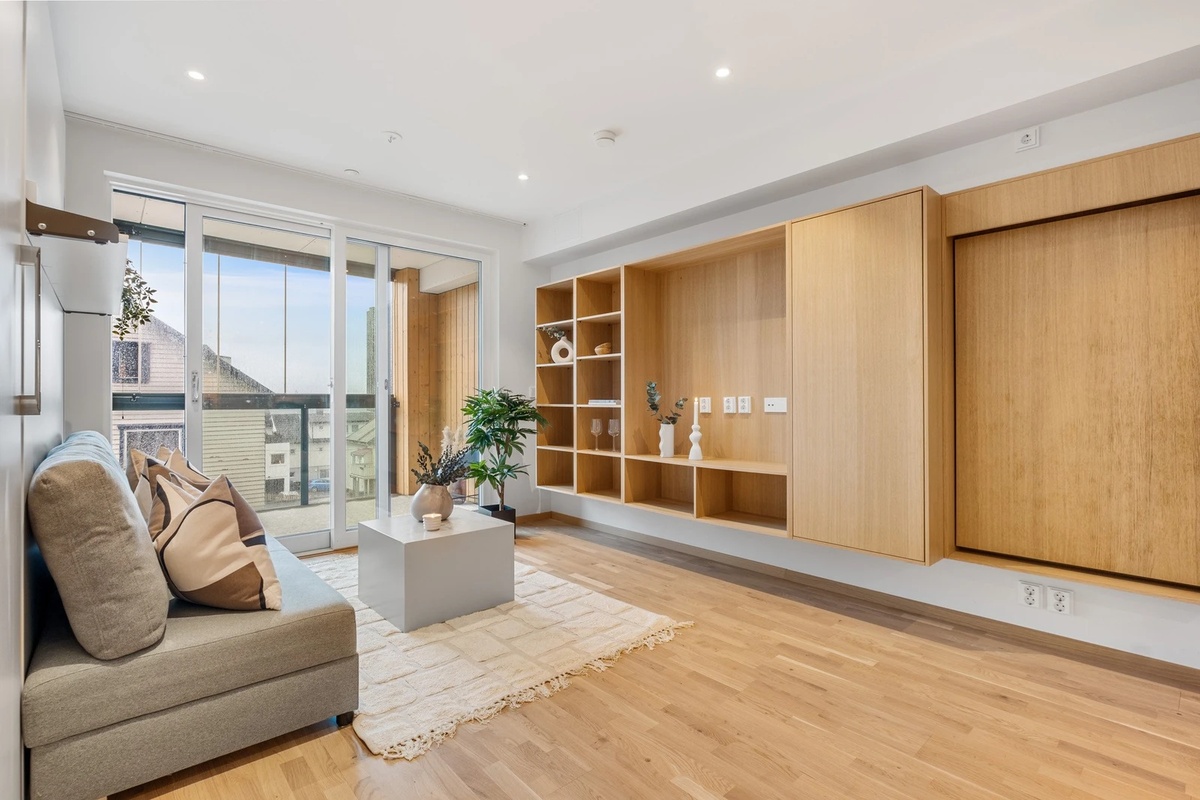 Praktisk og arealeffektiv ettromsleilighet fra 2023 med innglasset balkong leies ut helt- eller delvis møblert.