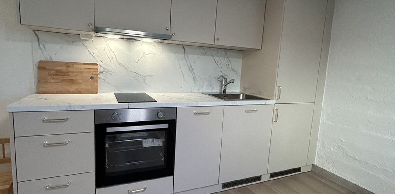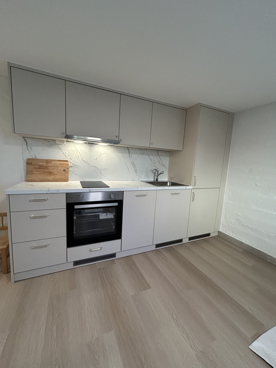• Nytt og moderne kjøkken med alle hvitevarer: kjøleskap, fryser, ovn, induksjonstopp og oppvaskmaskin. God plass til spisebord/kontorplass