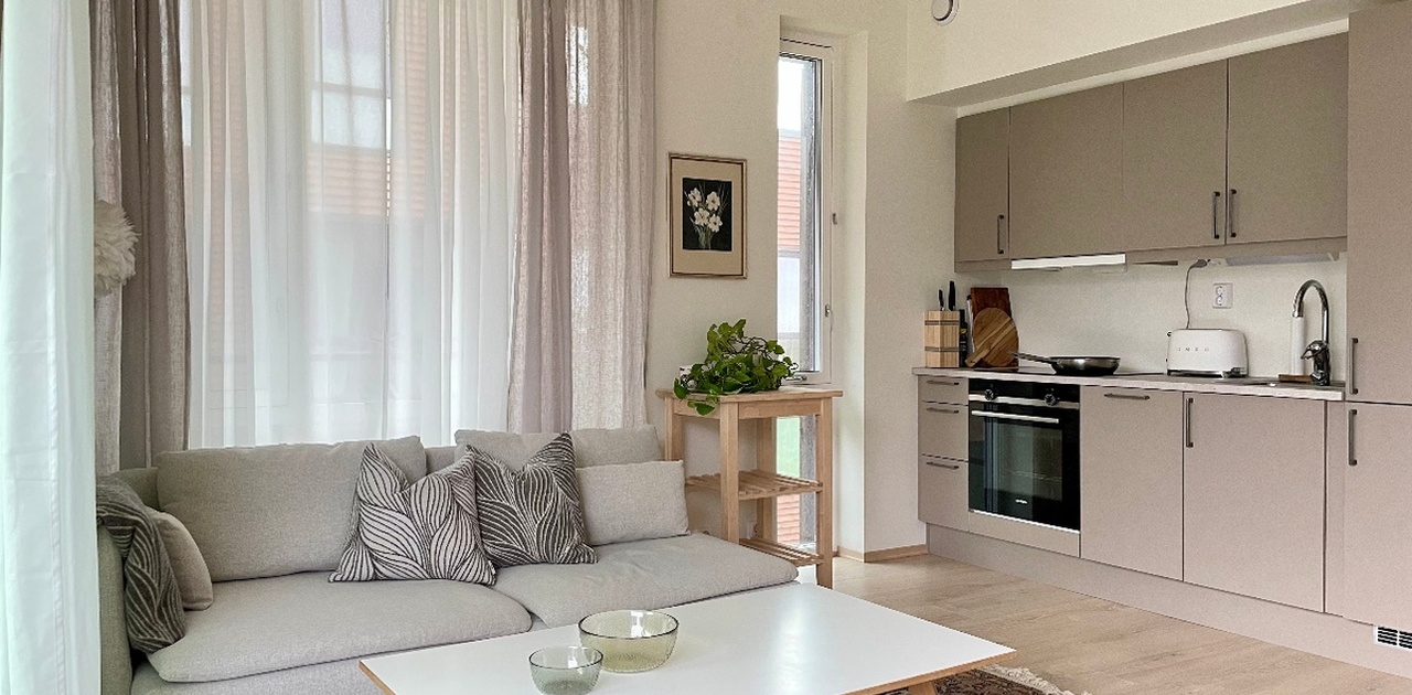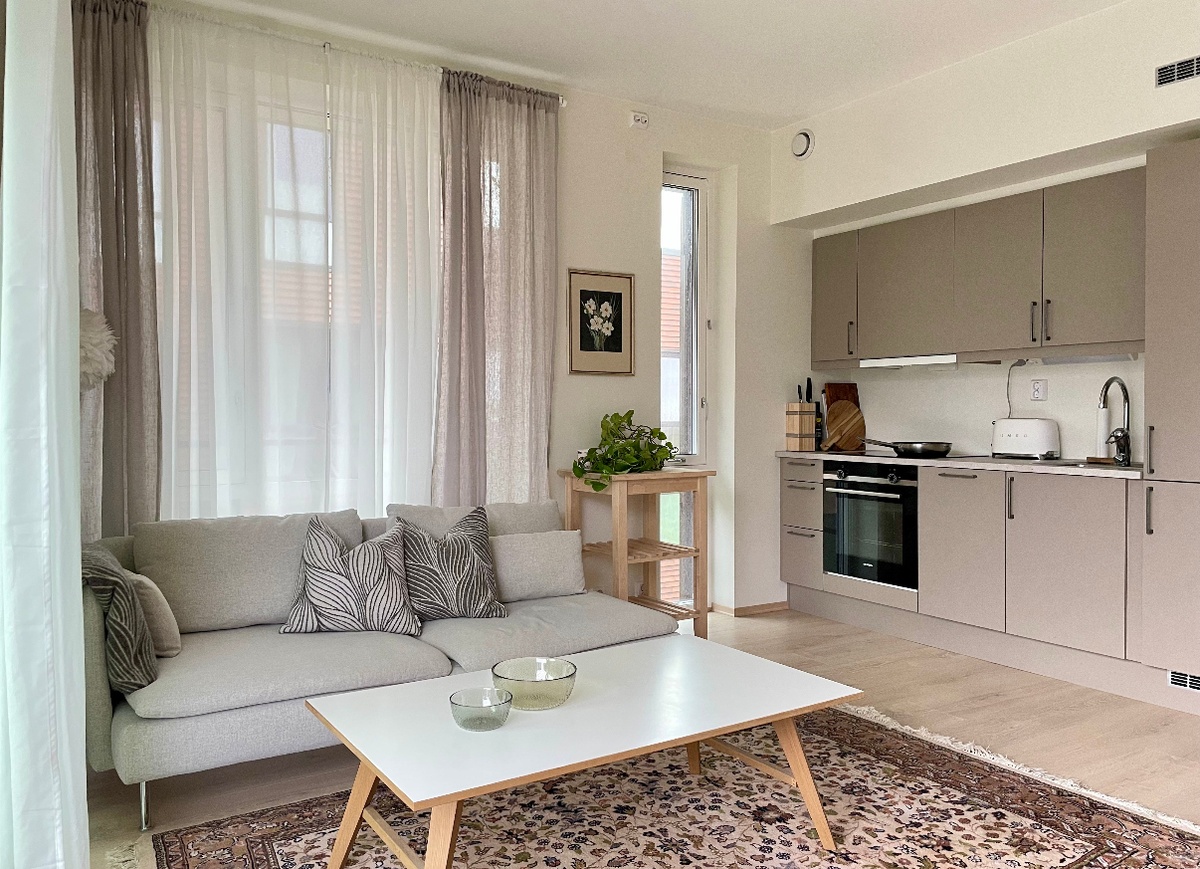 Stue/kjøkken med åpen løsning og kvalitetskjøkken fra HTH med integrerte hvitevarer fra Siemens. 2 soverom med plass til seng, garderobe og evt. hjemmekontor. Bad med fliser, varme i gulv og opplegg for vaskemaskin.
