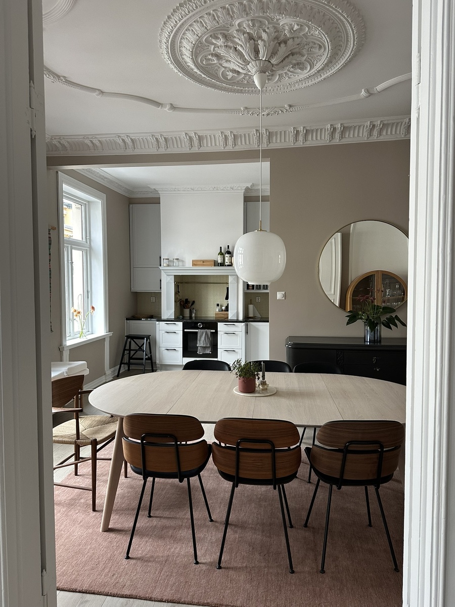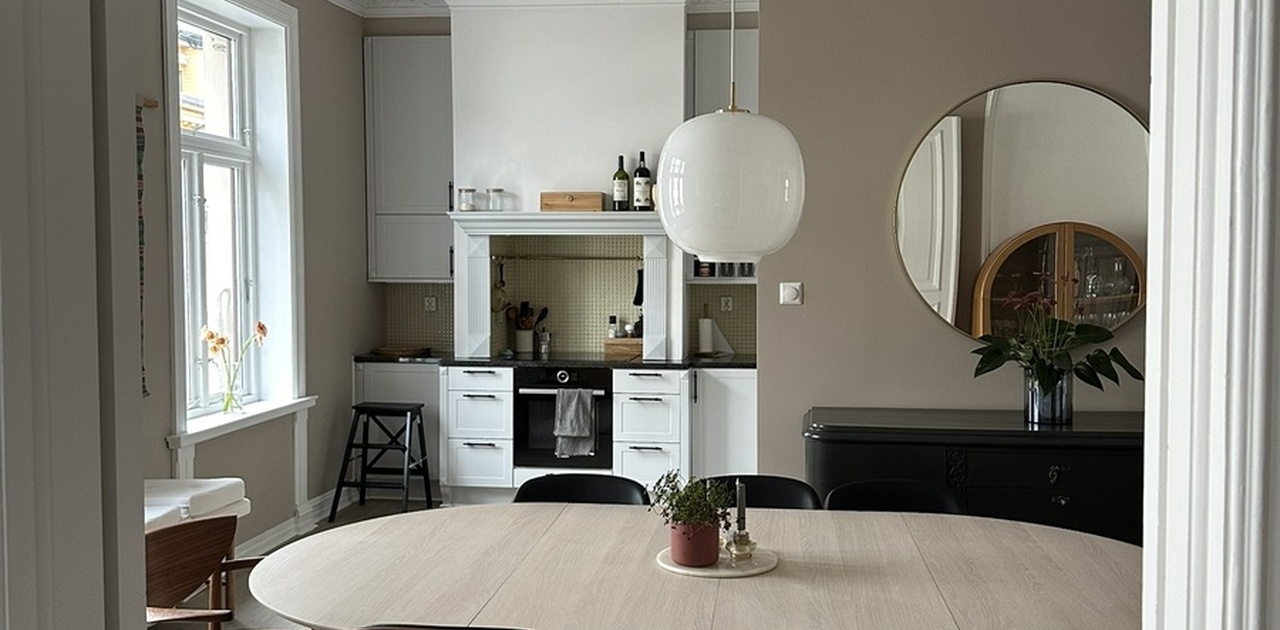 Leiligheten har en gjennomgående skandinavisk fargepalett, kombinert med klassiske detaljer som gir en elegant atmosfære.