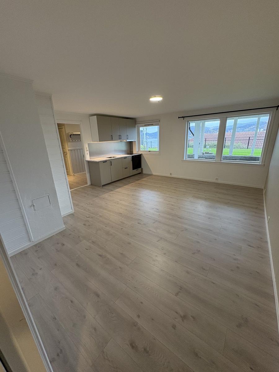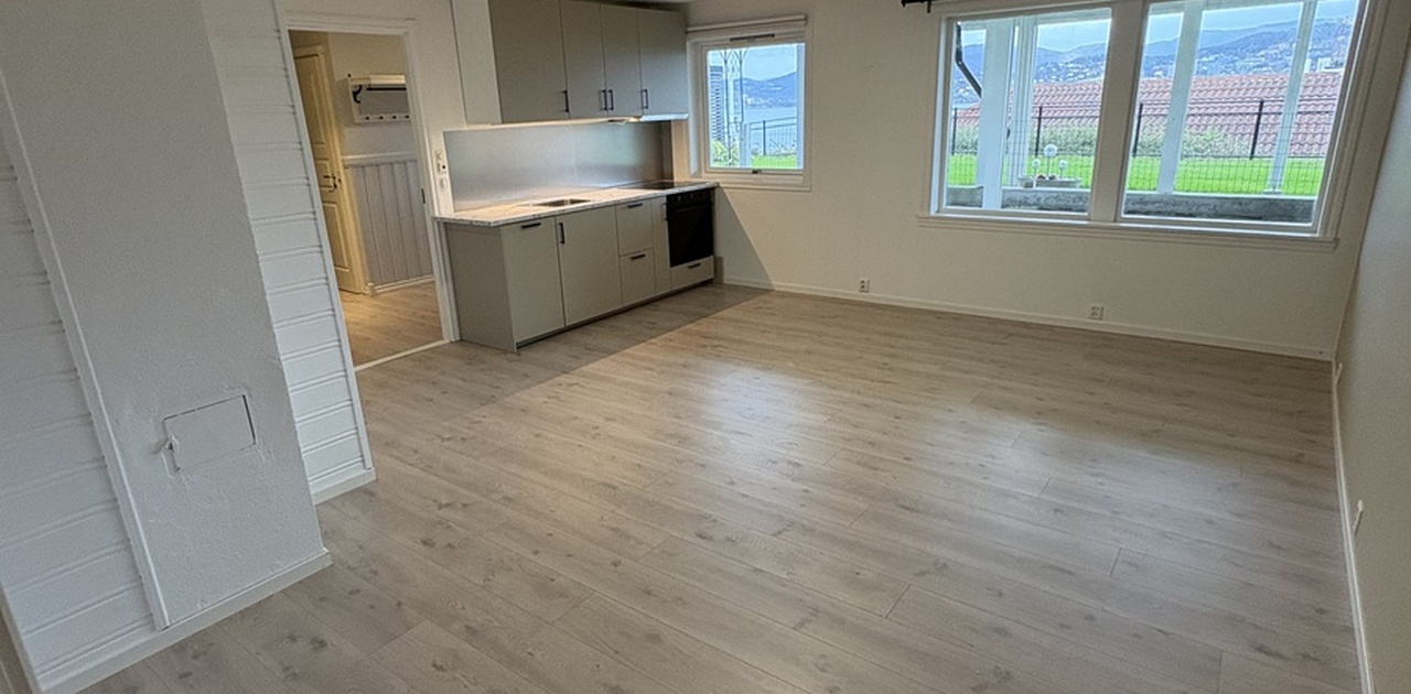 Inne på oppholdsrommet (åpen stue/kjøkken løsning) er det montert nytt kjøkken fra IKEA. Det er helt nytt (okt. 25) og har alt man trenger av integrerte hvitevarer. Fra kjøkkenet har du nydelig utsikt utover Byfjorden og Byfjellene.