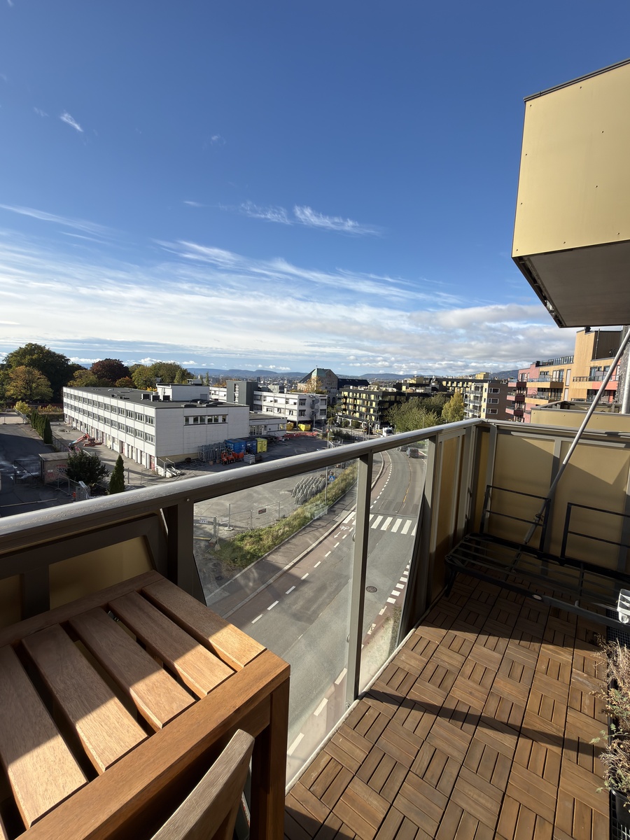 Lys og lekker 3-roms med to balkonger, herlig utsikt og gode solforhold. Leiligheten er fra 2018 og holder en gjennomgående god standard, med åpen stue- og kjøkkenløsning, flislagt bad og varme i gulv. To balkonger på henholdsvis 6 og 12 kvm. Godt med lagringsplass i innvendig bod. Fjernvarme og felles varmtvann. Leiligheten ligger i 5. etg med heisadkomst fra bakkeplan. Kjøkkeninnredningen er fra Norema med hvite slette fronter og belysning mellom benk og overskap samt komfyrvakt og ventilator over kokesonen. Fra stuen er det adgang til en 6 kvm balkong med gode solforhold og utsikt. Ligger vis a vis utbygging av nytt NRK-bygg. Samtlige rom har 3-stavs hvitpigmentert eikeparkett på gulv, solskjerming fra Bovik montert i 2019. Fra hovedsoverommet er det adgang til en 12 kvm balkong som vender inn mot borettslaget.