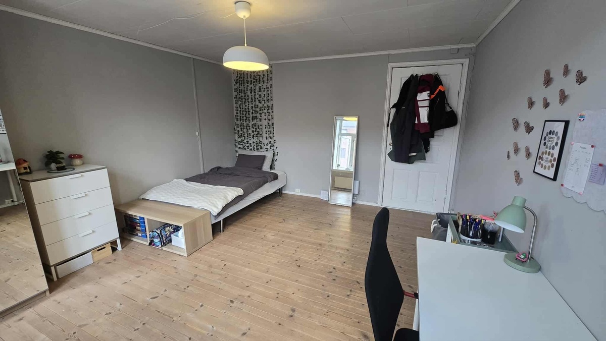 Det er ikke noen felles stue, men alle rommene har god plass til en sofakrok i tillegg til seng, skap, kommoder og pult. Det er store vinduer som gir masse naturlig lys, og klesskap og seng følger med.