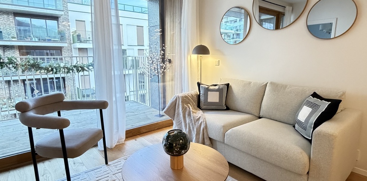 Eksklusiv og helt ny 2-roms i Vannkunsten Syd – fullt møblert med kontor og stor balkong