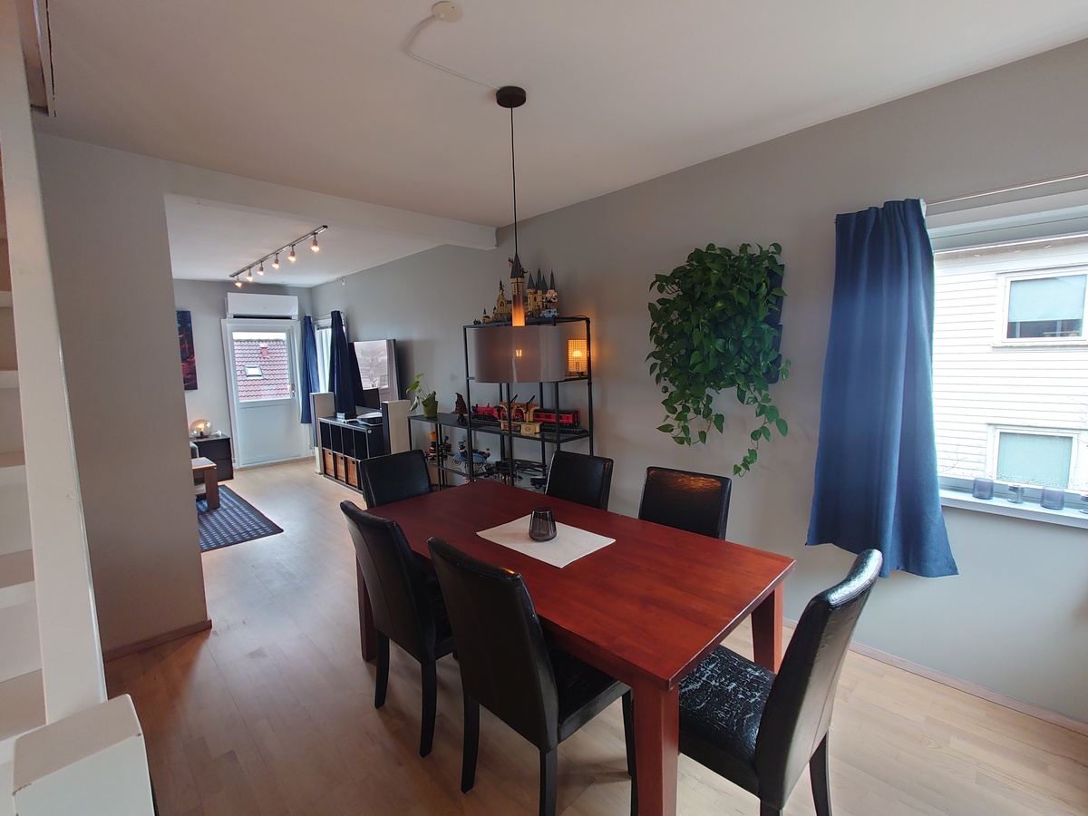 Fin leilighet over to etasjer, med bad, soverom, kjøkken, veranda og stor stue på første plan, og stor loftsstue/soverom på andre plan. Loftet er godkjent som soverom, og har sovesofa.