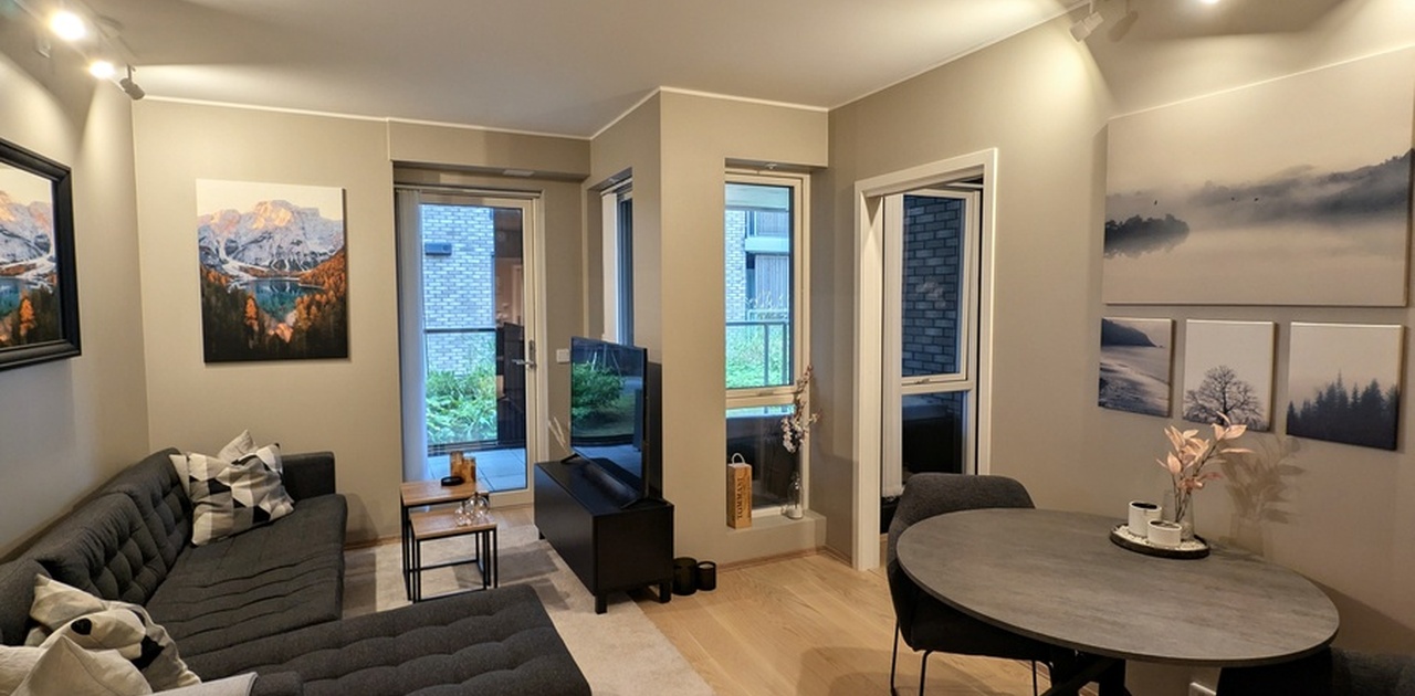 Innbydende og moderne 2-roms leilighet med høy standard og en stor, privat terrasse. Privat parkering m. lademuligheter
