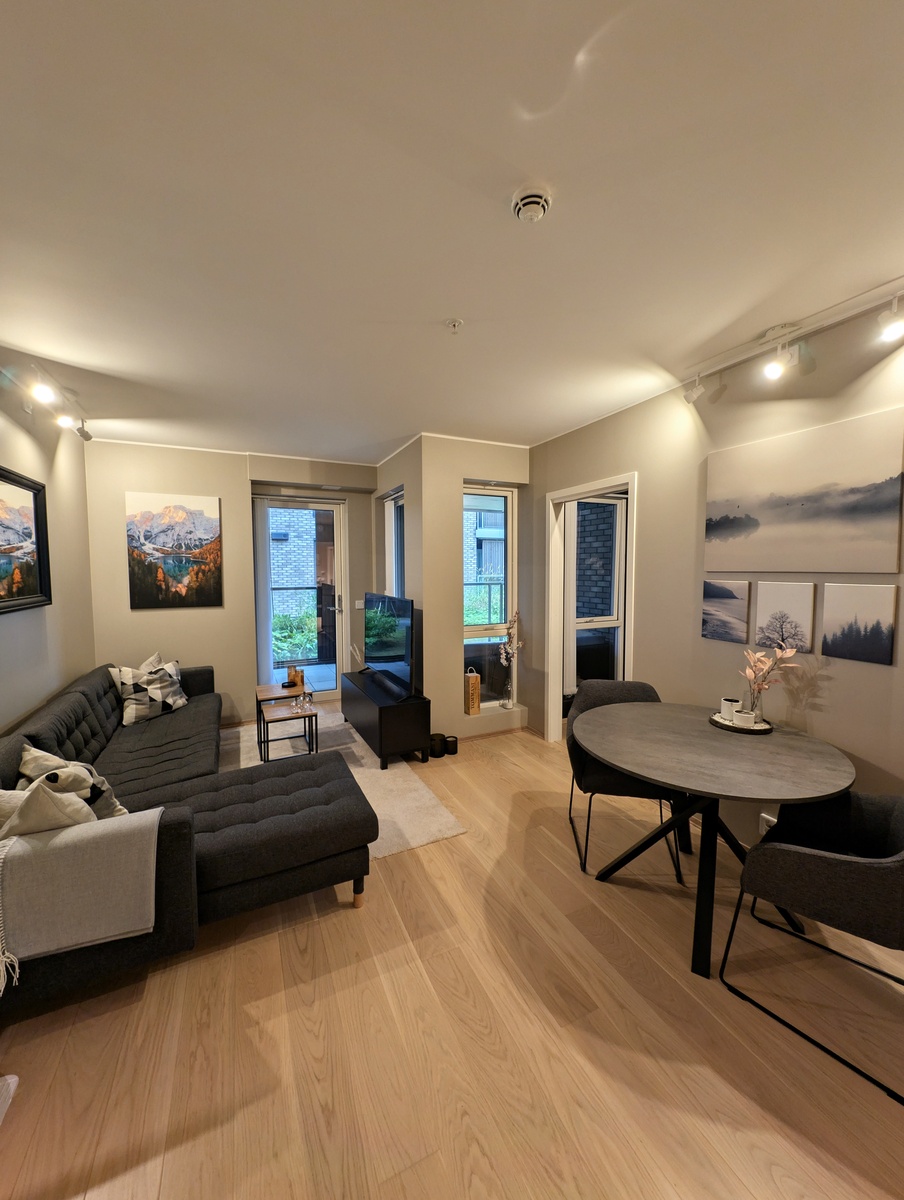 Innbydende og moderne 2-roms leilighet med høy standard og en stor, privat terrasse. Privat parkering m. lademuligheter