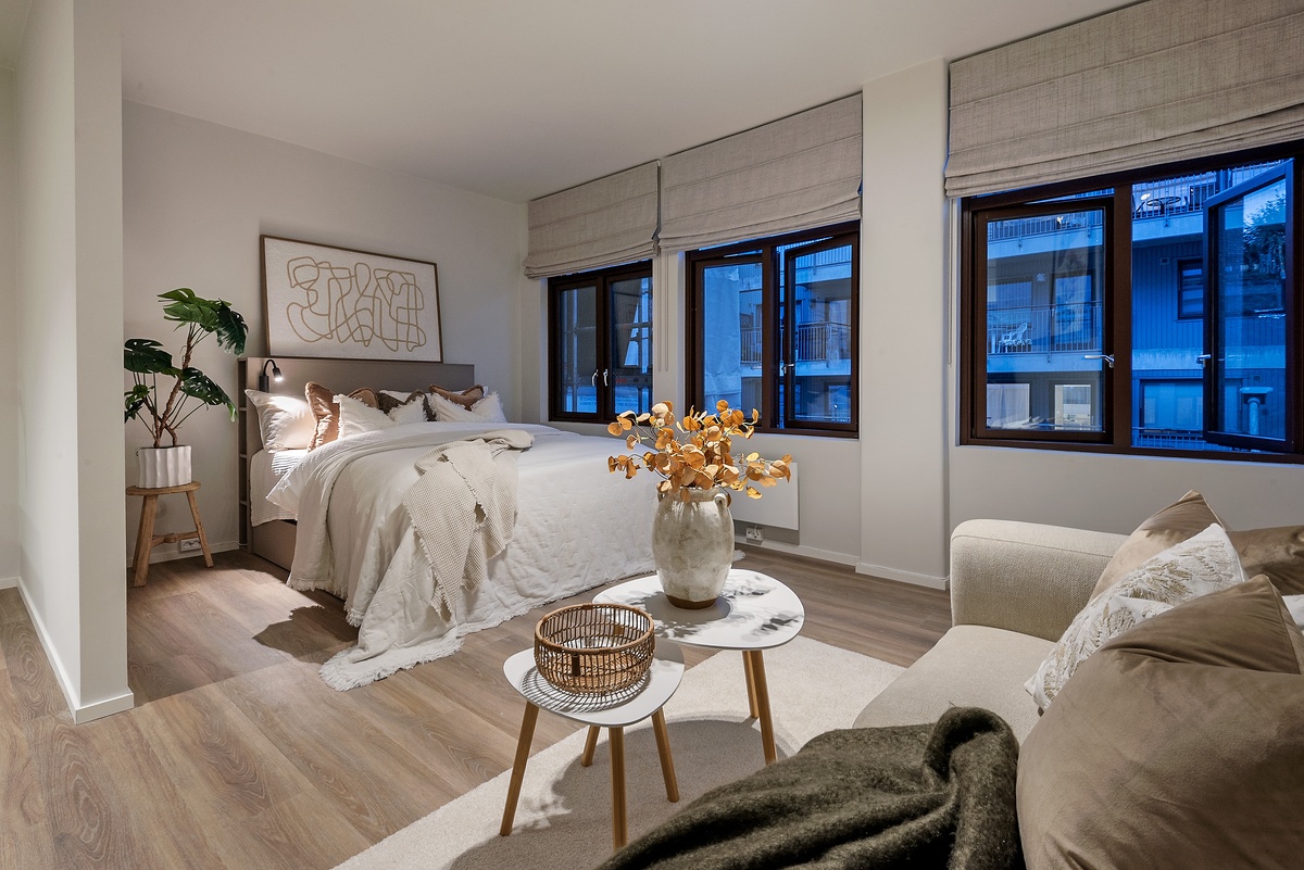 I september 2025 blir vårt nyeste prosjekt ferdigstilt! Flytt rett inn i vår splitter nye leilighet. Her bor du komfortabelt i din helt egen leilighet med god- plass og takhøyde, høy standard og moderne preg. Hver enhet er utstyrt med 150-seng, kjøkken og bad, spisebord med stoler, pult og gode oppbevaringsmuligheter med garderobeskap, skuffer under seng og hyller.