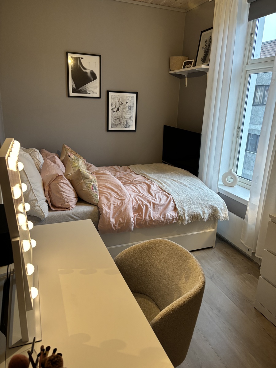 Jeg leier ut rommet mitt for vårsemesteret 2026, da jeg skal på utveksling. Rommet er romslig og innbydende, og leies ut fult møblert med seng, skrivepult, kommoder og nattbord. Overtakelse er 1.januar. Du deler bad med de andre jentene og alle nødvendige hvitevarer finnes i leiligheten.