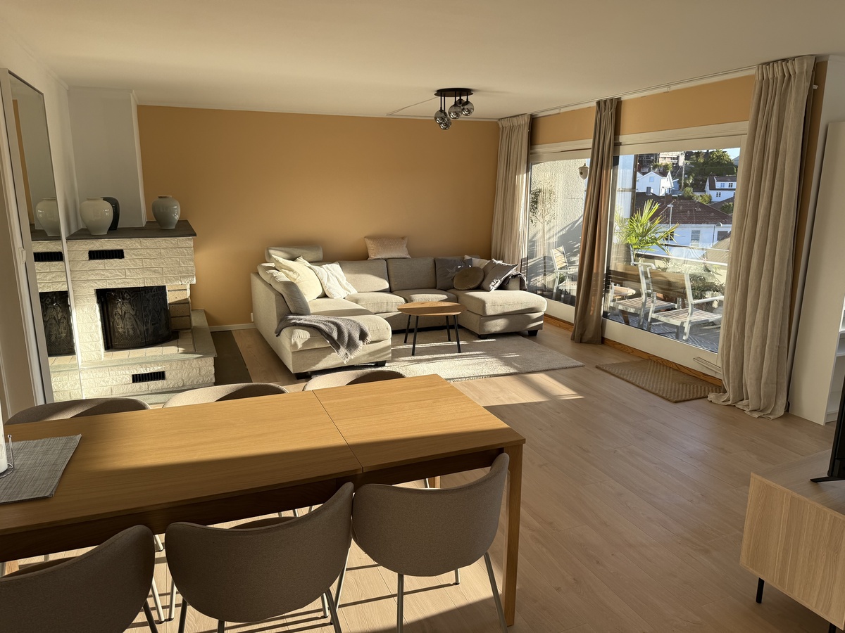 - Lys stue med store vinduer og god plass til spisebord