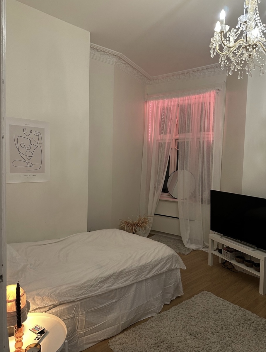 Rommet er på cirka 22 kvm, lyst og luftig med høyt under taket og store vinduer☀️ På rommet følger det med et romslig garderobeskap. Pult og seng kan kjøpes for en hyggelig pris ✨