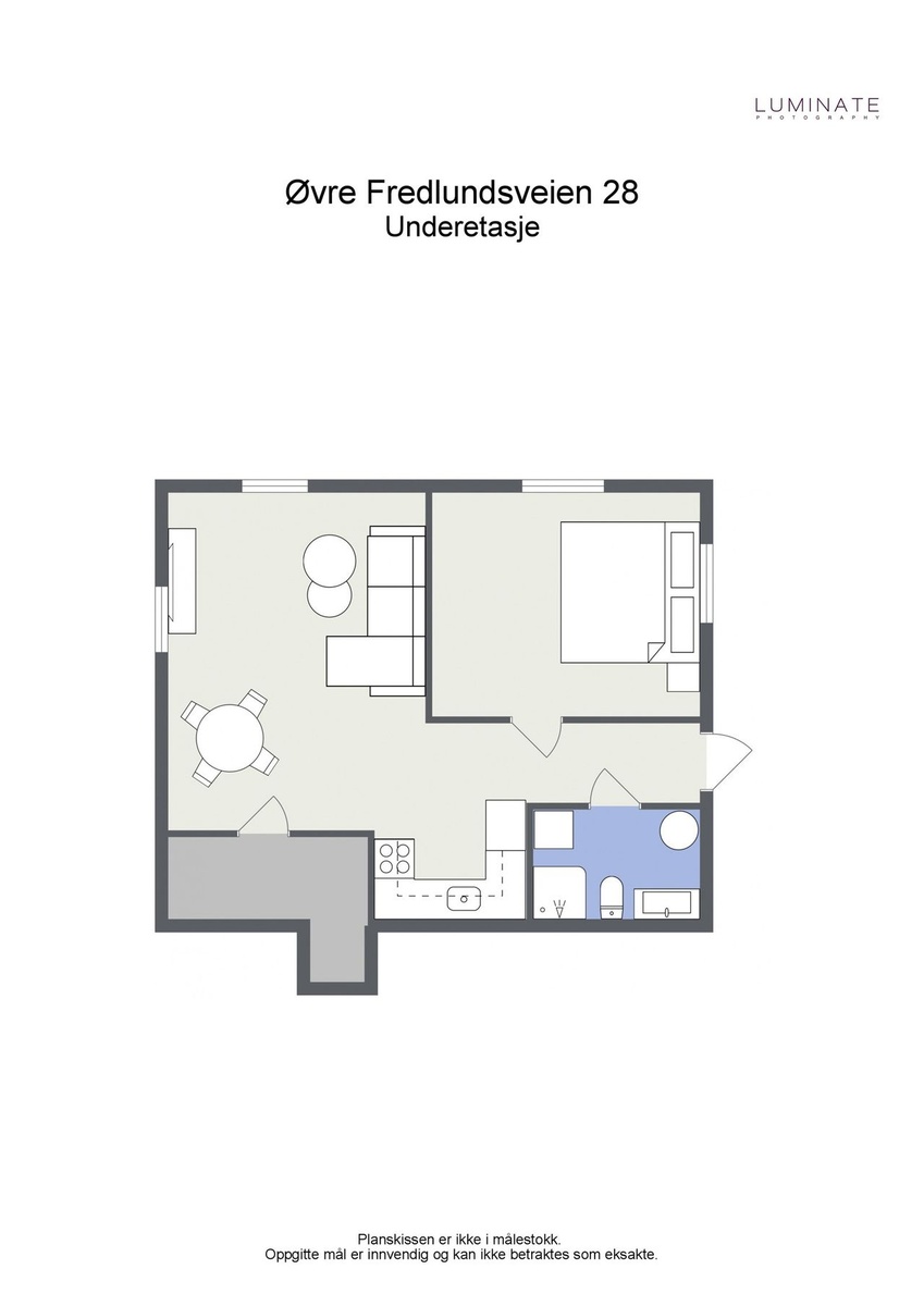 Leiligheten har et romslig bad med vaskemaskin, soverom med 150 cm seng og skap, samt en lys stue med kjøkkenkrok utstyrt med hvitevarer (kjøleskap med fryser, oppvaskmaskin og komfyr). Det er også en innvendig bod og en privat terrasse med plass til utemøbler.