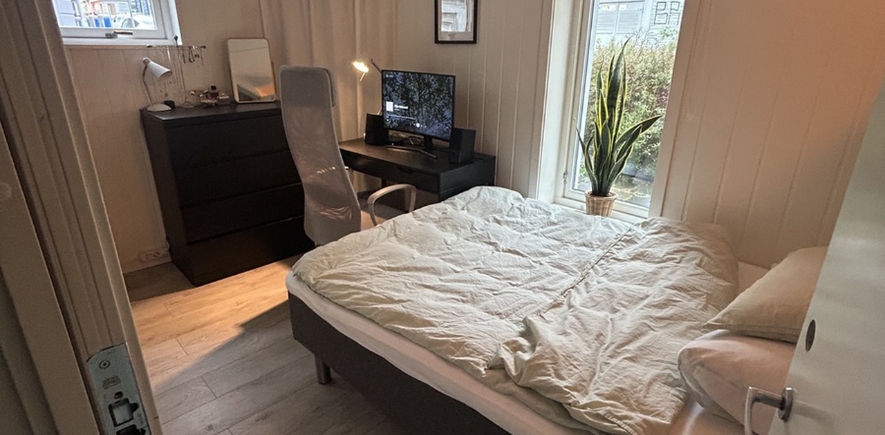 Rommet som leies ut er møblert med seng, skap, pult og kommode. Det er mye naturlig lys, og det er plass til det du skal trenge. Leiligheten har også et rom vi bruker som bod/oppbevaring.