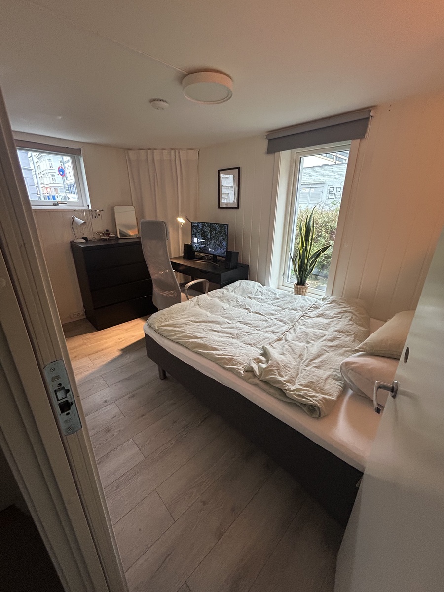 Rommet som leies ut er møblert med seng, skap, pult og kommode. Det er mye naturlig lys, og det er plass til det du skal trenge. Leiligheten har også et rom vi bruker som bod/oppbevaring.