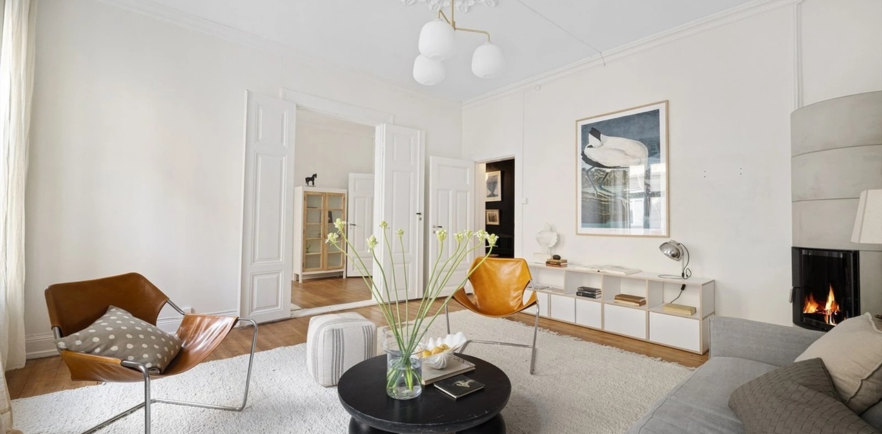Leiligheten har en praktisk planløsning med gjennomgående, romslige oppholdsrom, ca. 3,1 m takhøyde og klassiske detaljer som tregulv, doble fløydører, rosetter og peisovn. Kjøkkenet (fra 2017) er uvanlig stort og vender mot en skjermet, stille bakgård. Boligen har en smart vaskeromsløsning, tre gode soverom og to bad. Beliggenheten er meget sentral, men likevel tilbaketrukket, med direkte adkomst til den rolige bakgården. Leiligheten leies ut fordi jeg må selge min nåværende bolig. Merk: Den er ikke møblert som på bildene, men vil være delvis møblert ved utleie.