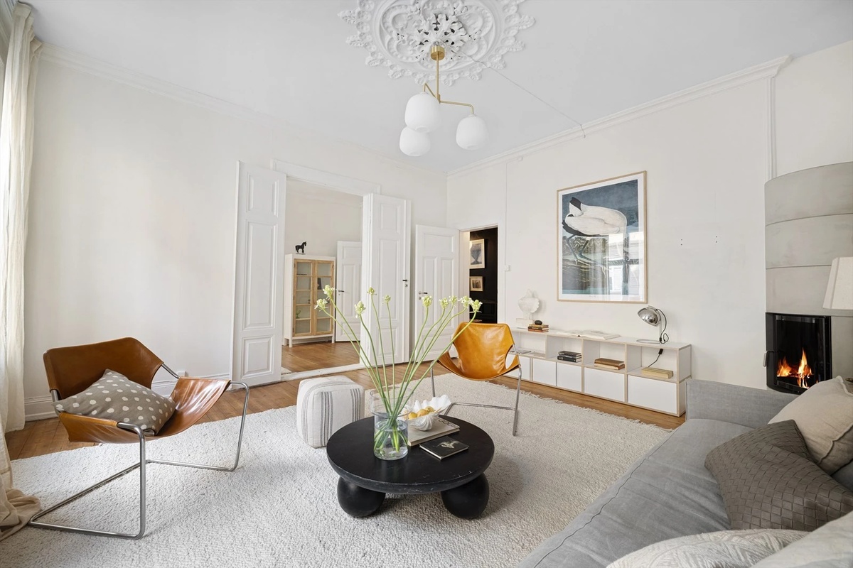 Leiligheten har en praktisk planløsning med gjennomgående, romslige oppholdsrom, ca. 3,1 m takhøyde og klassiske detaljer som tregulv, doble fløydører, rosetter og peisovn. Kjøkkenet (fra 2017) er uvanlig stort og vender mot en skjermet, stille bakgård. Boligen har en smart vaskeromsløsning, tre gode soverom og to bad. Beliggenheten er meget sentral, men likevel tilbaketrukket, med direkte adkomst til den rolige bakgården. Leiligheten leies ut fordi jeg må selge min nåværende bolig. Merk: Den er ikke møblert som på bildene, men vil være delvis møblert ved utleie.
