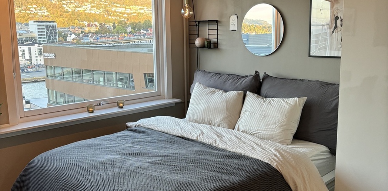 Denne fine, lille leiligheten ligger sentralt på Gyldenpris i Bergen. Bussen stopper like ved og tar deg til sentrum på 4 minutter, eller du kan gå på ca. 20 min. Leiligheten har store vinduer som gir godt dagslys og utsikt over Fløyen og Ulriken. Leiligheten leies ut fullt møblert med alt du trenger, så her kan du flytte rett inn og trives godt!
