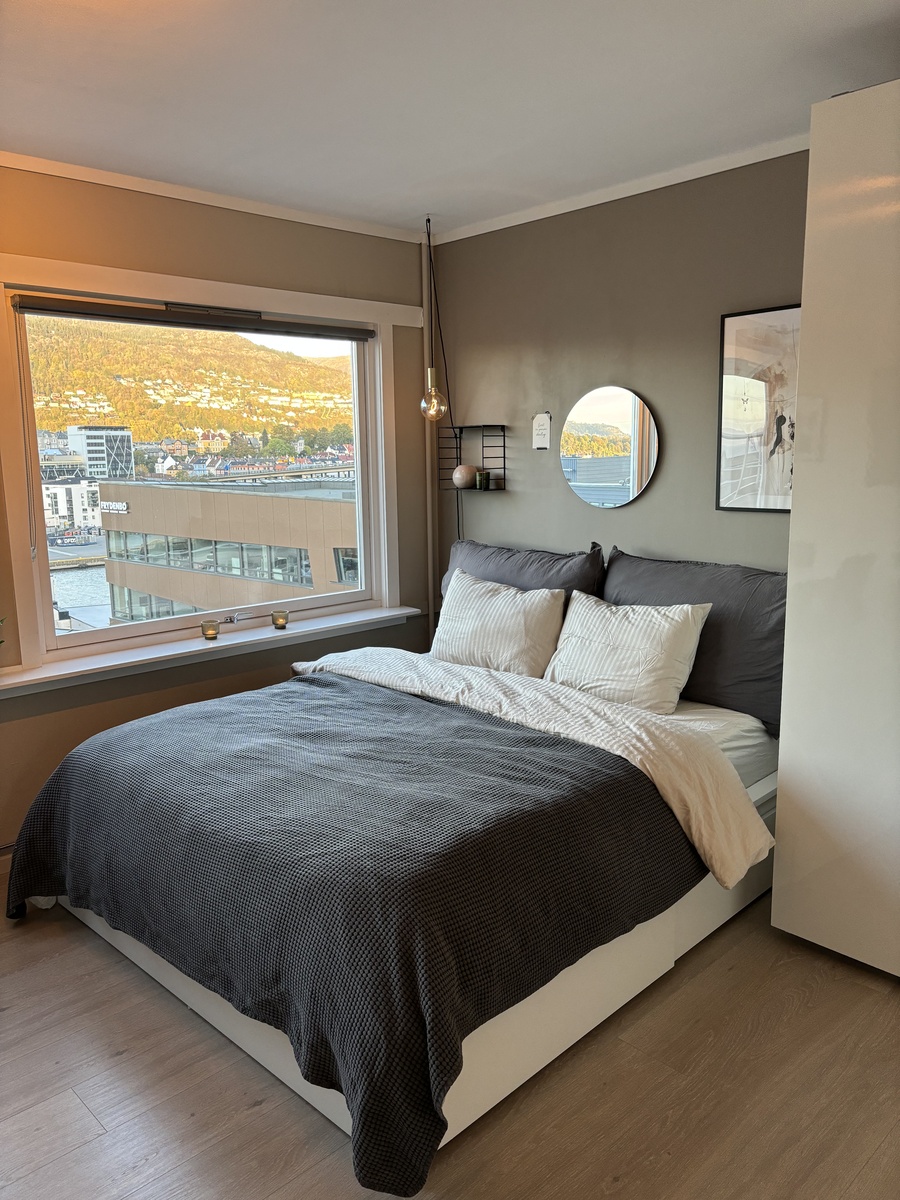 Denne fine, lille leiligheten ligger sentralt på Gyldenpris i Bergen. Bussen stopper like ved og tar deg til sentrum på 4 minutter, eller du kan gå på ca. 20 min. Leiligheten har store vinduer som gir godt dagslys og utsikt over Fløyen og Ulriken. Leiligheten leies ut fullt møblert med alt du trenger, så her kan du flytte rett inn og trives godt!