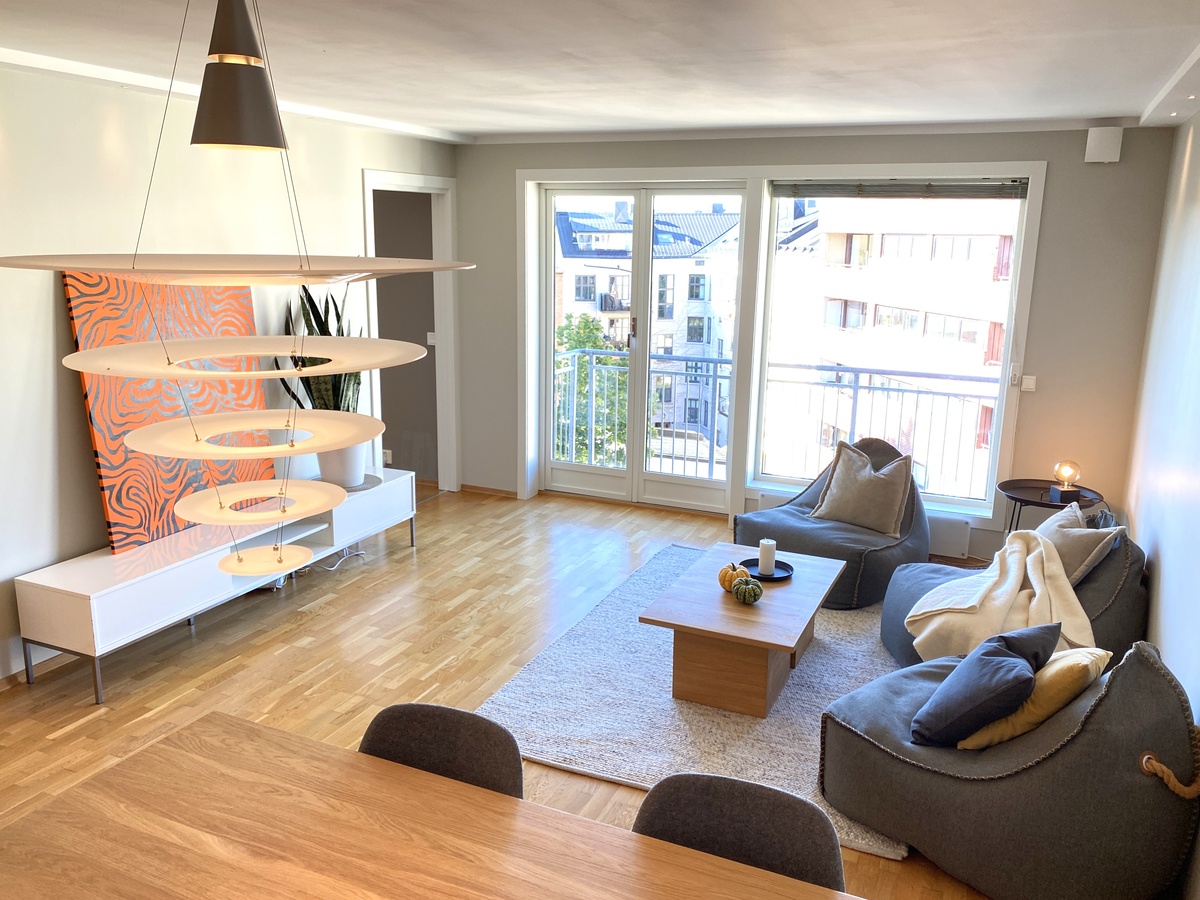 Her får du en innbydende toppleilighet med flott beliggenhet i byggets 5. etasje – høyt, luftig og med rikelig dagslys. Den gjennomtenkte planløsningen og de store vindusflatene skaper en lys og trivelig atmosfære du vil trives i. *Se oppdaterte bilder av møblering.