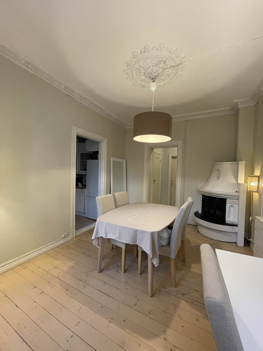Leiligheten er møblert med spisebord og hvitevarer, og rommet som leies ut er ummøblert. Det er over 4 m høyt under taket i leiligheten, med mye oppbevaringsmuligheter da vi har tilgang til både stor kjellerbod og loftsbod.