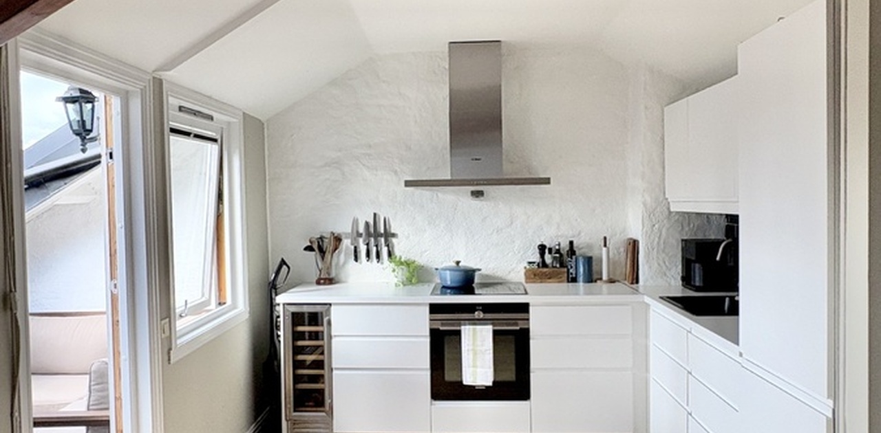 Kjøkken: Stilrent og moderne kjøkken i hvitt med integrerte hvitevarer(ovn, oppvaskmaskin), god skapplass og fine arbeidsflater. Her er det lagt vekt på både design og funksjonalitet.