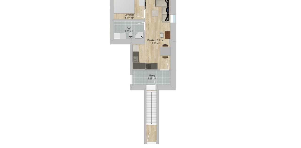 Hybelen består har en praktisk planløsning med en åpen stue/kjøkkenløsning, soverom og bad. I tillegg er det en gang som deles med en annen hybel. Se plantegning for et nærmere inntrykk. Alle overflater er nye og det vil etableres nytt kjøkken fra Epoq. Hybelen leveres med hvitevarer (ink. oppvaskmaskin og vaskemaskin) og garderobeskap, ellers uinnredet.