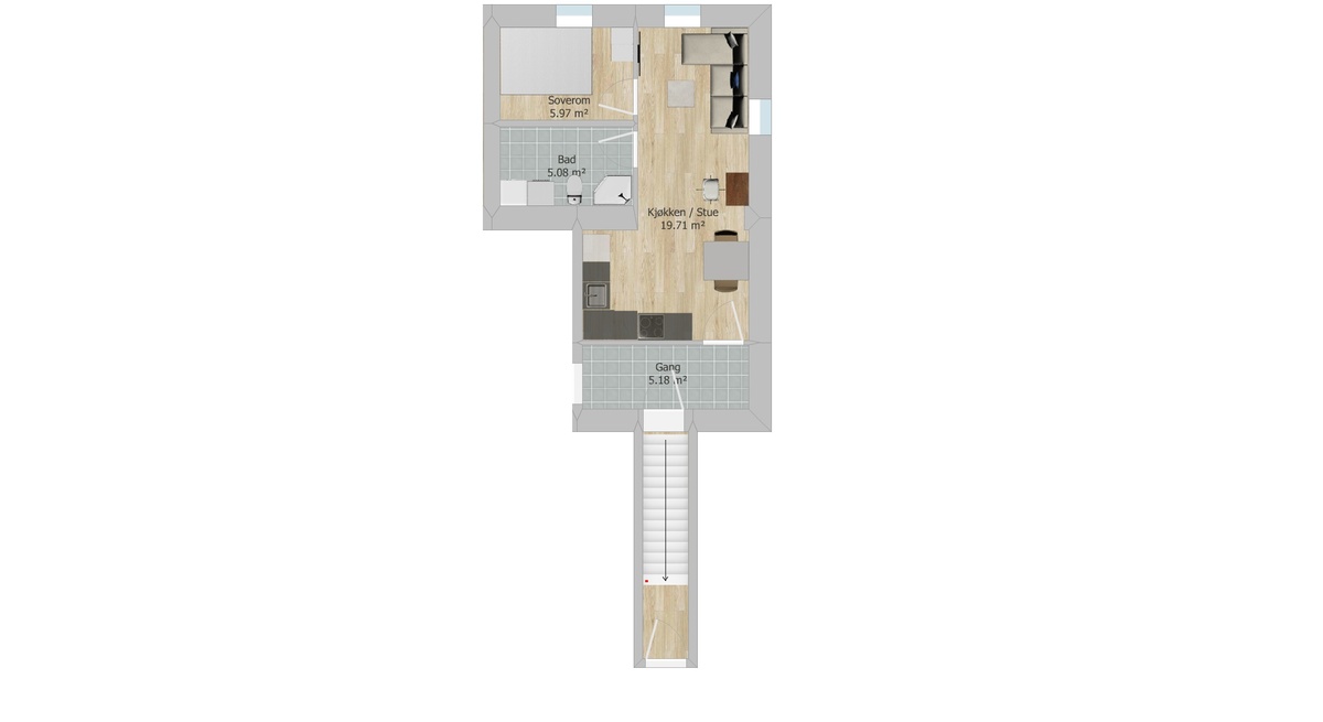 Hybelen består har en praktisk planløsning med en åpen stue/kjøkkenløsning, soverom og bad. I tillegg er det en gang som deles med en annen hybel. Se plantegning for et nærmere inntrykk. Alle overflater er nye og det vil etableres nytt kjøkken fra Epoq. Hybelen leveres med hvitevarer (ink. oppvaskmaskin og vaskemaskin) og garderobeskap, ellers uinnredet.