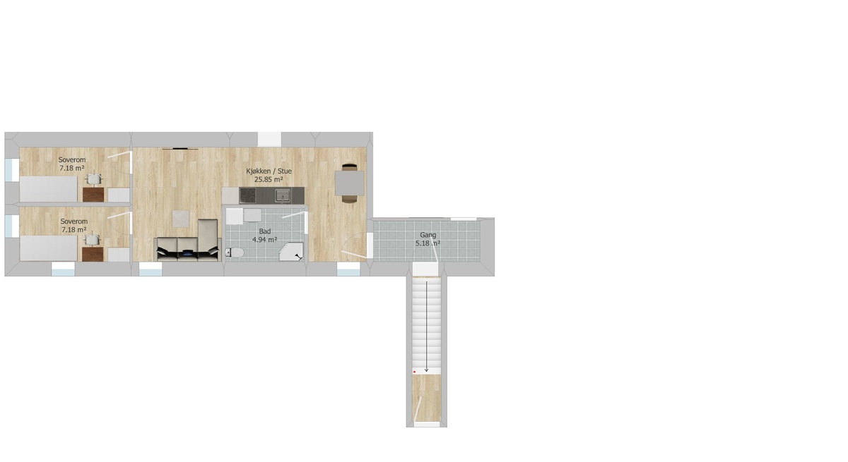 Hybelen består har en praktisk planløsning med en åpen stue/kjøkkenløsning, 2 soverom og bad. I tillegg er det en gang som deles med en annen hybel. Se plantegning for et nærmere inntrykk. Alle overflater er nye og det vil etableres nytt kjøkken fra Epoq. Hybelen leveres med hvitevarer (ink. oppvaskmaskin og vaskemaskin) og garderobeskap, ellers uinnredet.