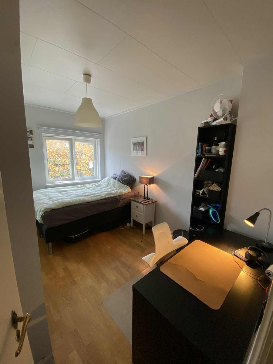 Rommet er ledig fra 01.01.2026, med muligheter for litt tidligere overtakelse. Soverommet er på 11.6m2 totalt med god plass til lagring (1.7m2 integrert skapplass), dobbeltseng, skrivebord, nattbord og hylle.