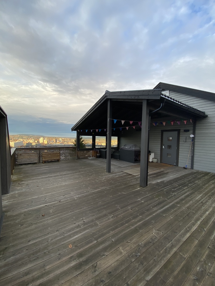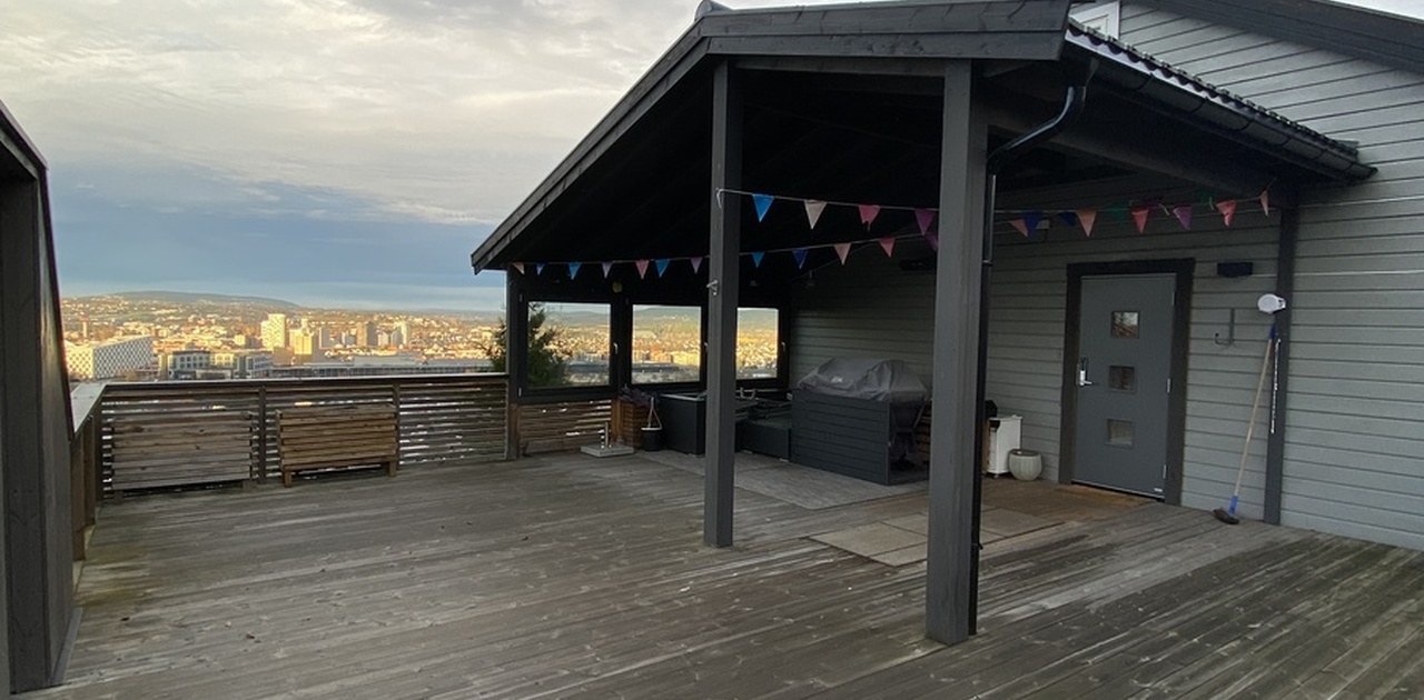 Leiligheten har en fantastisk utsikt mot Lillestrøm fra en stor terrasse.