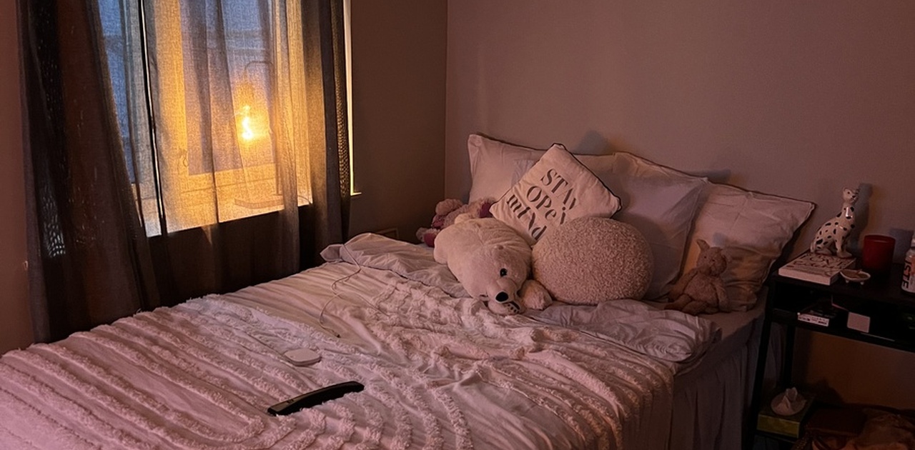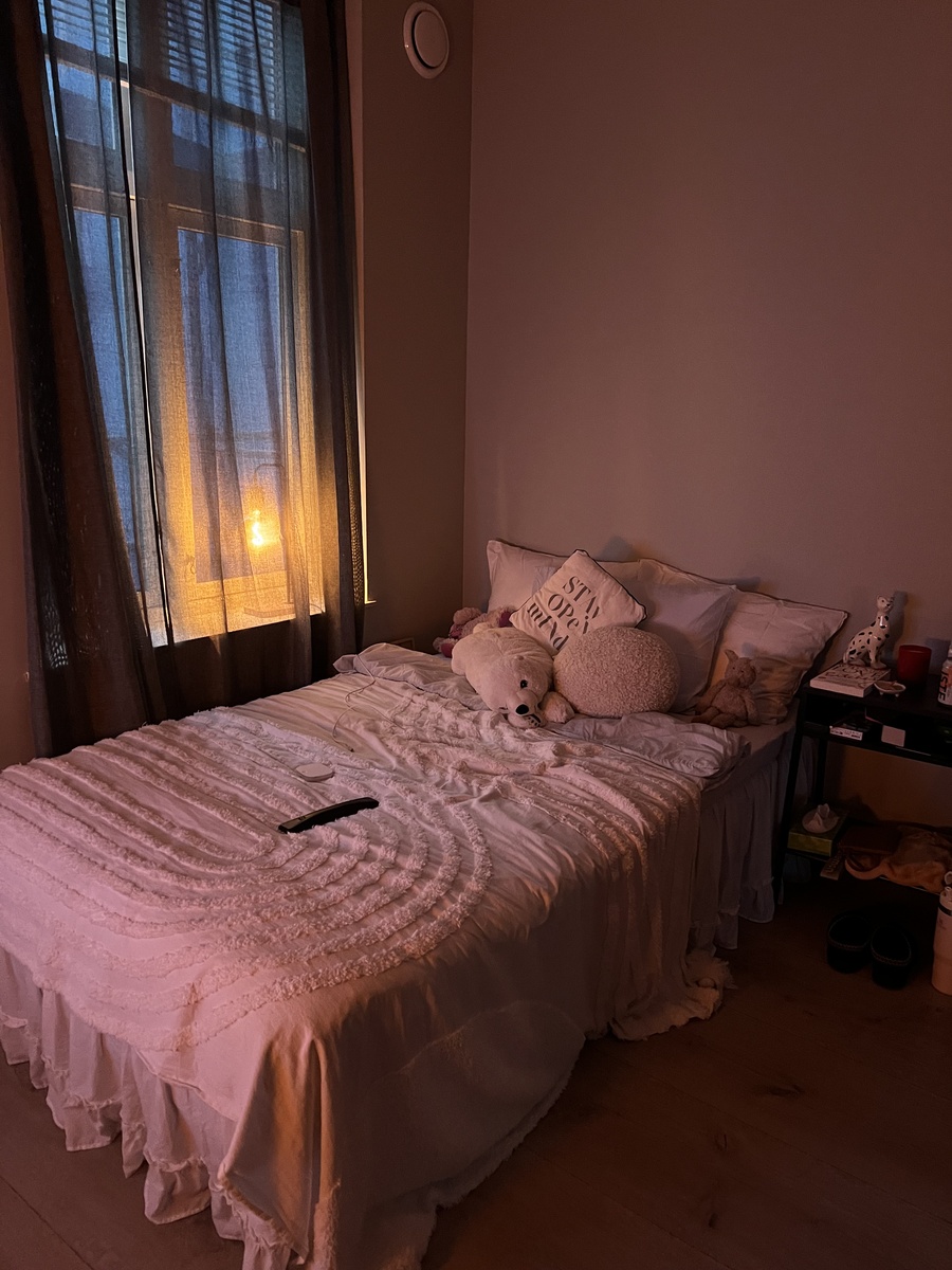 Rommet er det største i leiligheten og har vindu ut i bakgården, som gjør at man hører lite fra gaten. Per nå er det innredet, med skap, kommode, seng og pult.