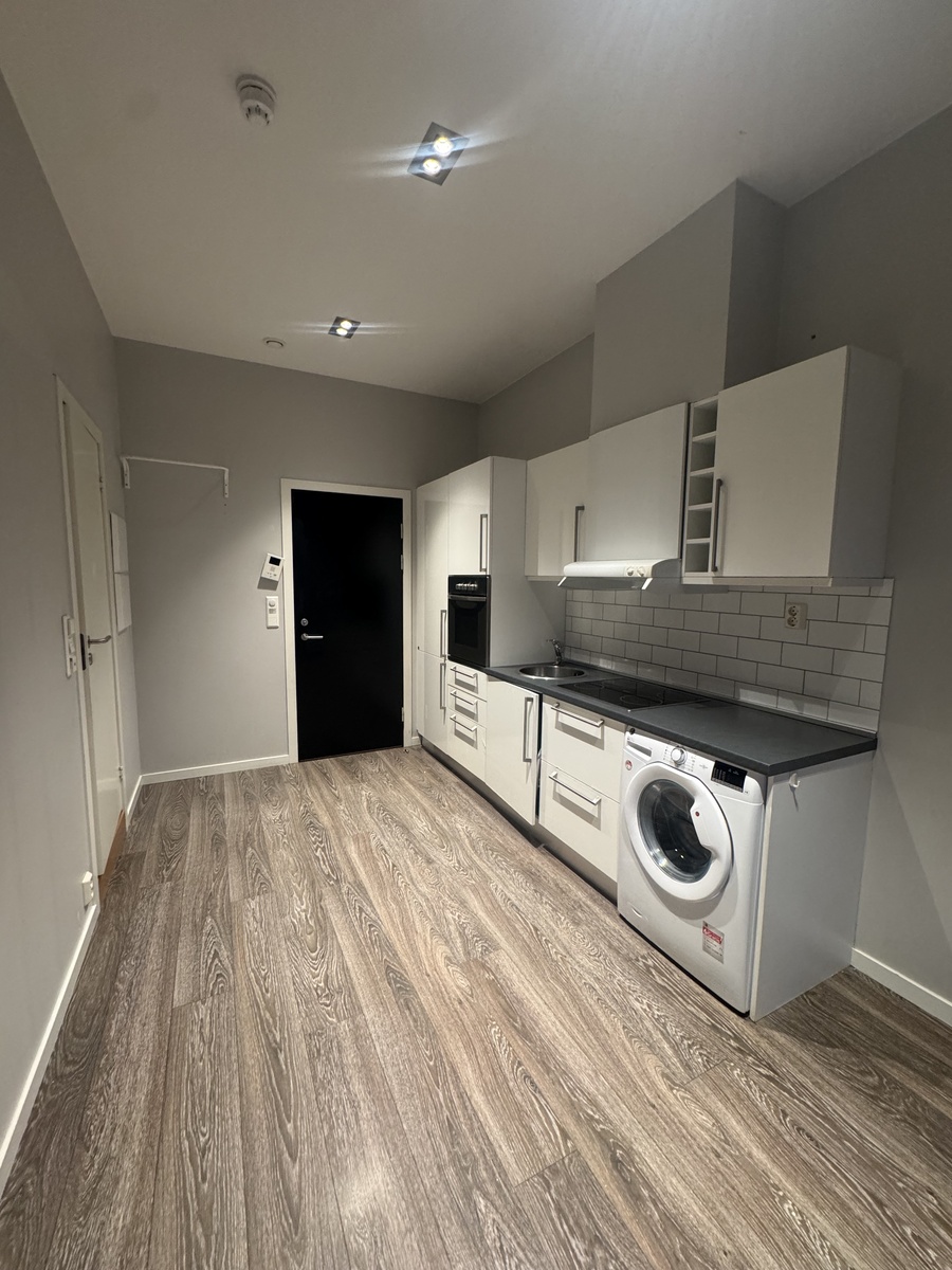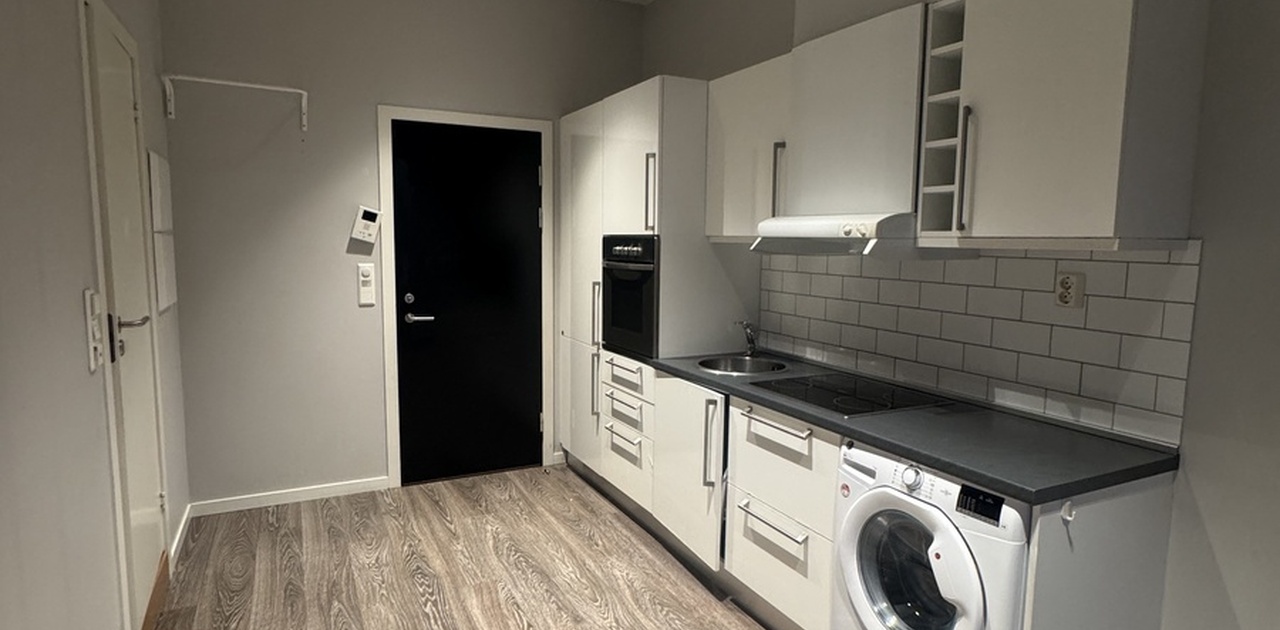 Leiligheten ligger i 3. etasje og består av stue med åpen kjøkkenløsning, ett soverom og ett moderne bad. Kjøkkenet har hvite, slette skapdører og leveres komplett med alle hvitevarer.