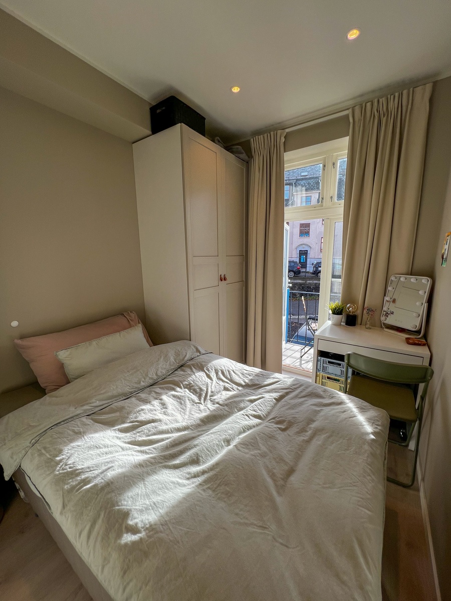 Jeg reiser på utveksling til våren, og leier derfor ut rommet mitt fra 1. februar - 30. juni 2026.🌸 Leiligheten er helt nyoppusset, og holder derfor veldig god standard. Rommet som leies ut er på 7 kvadratmeter. Det er også en søt, liten balkong tilhørende rommet.☺️ Rommet leies ut møblert, med 120-seng, stort klesskap, skrivepult og balkongmøbler. Leieprisen er på 7000 kr i måneden. - Strøm og internett kommer i tillegg til leieprisen.