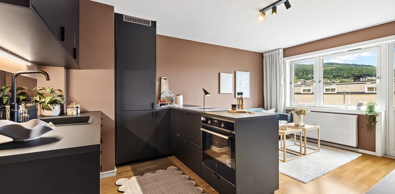 En smakfull og moderne toppleilighet i 5. etasje med herlig utsikt, kveldssol og perfekt beliggenhet midt i hjertet av Drammen.