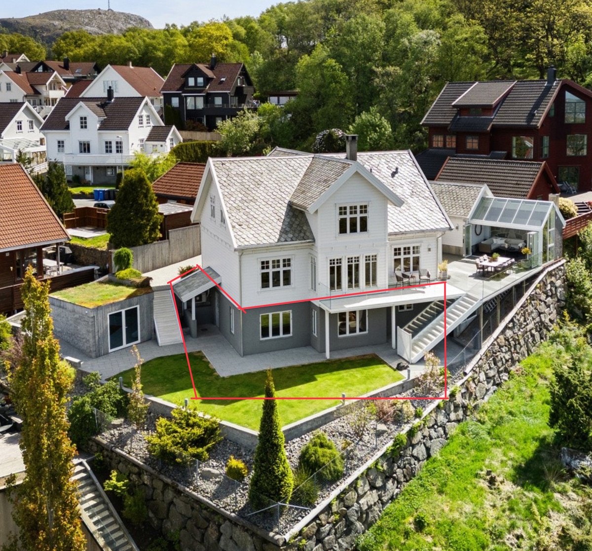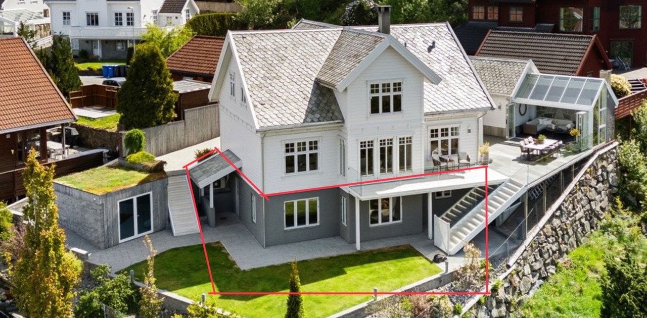 Det er egen inngang ved hagesiden av huset, utsiden av leiligheten kan benyttes som uteområde.