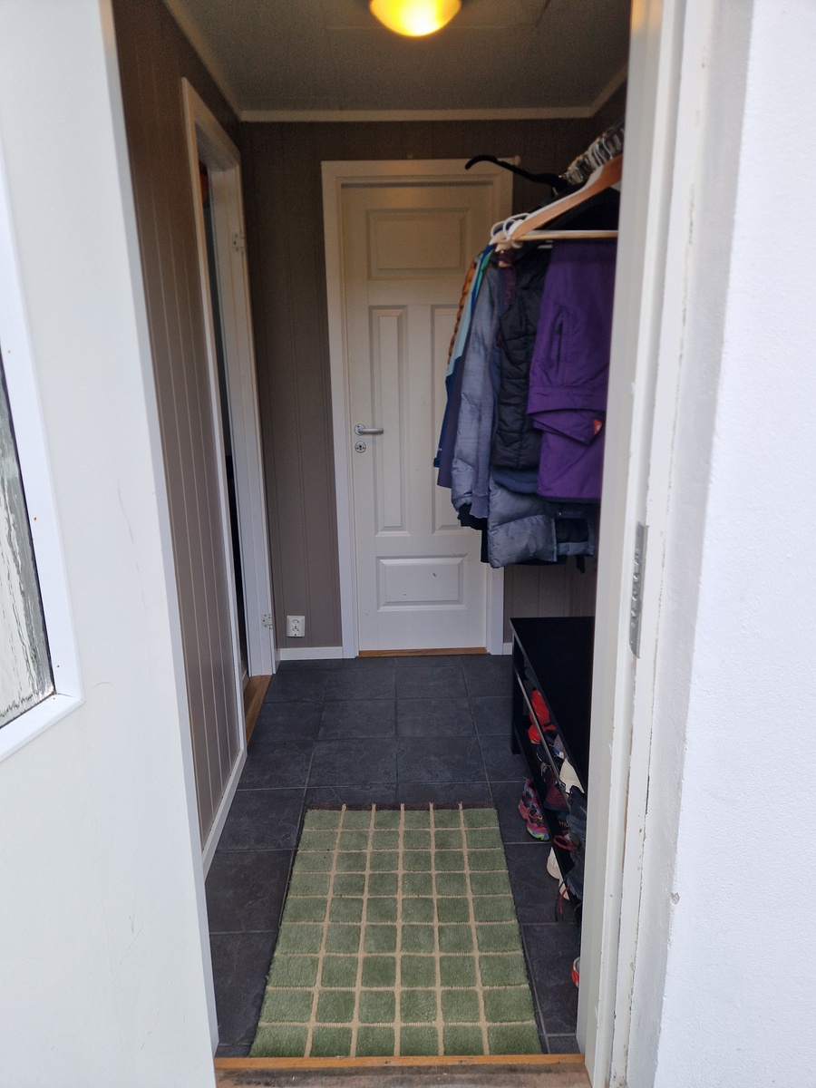 The apartment is a section of a larger house in a cozy Oslo neighborhood. It has its own private entrance and is well-insulated from the main house. The apartment is fully furnished and has an entryway with coat rack and shoe storage, floor heating in every room, a washing machine, dishwasher, well-stocked kitchen, home gym equipment, and comfortable living, dining, and sleeping areas. It is perfect for a single person or couple.